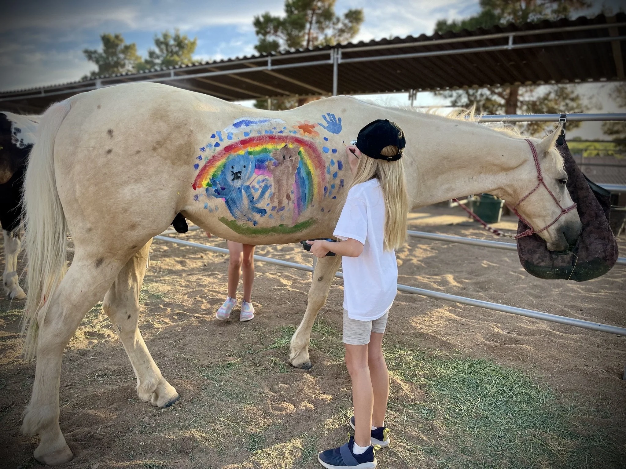 After we finish painting, you are welcome to help us give the horses baths to wash off the paint. Many of our guests enjoy this part as much as the painting 😊